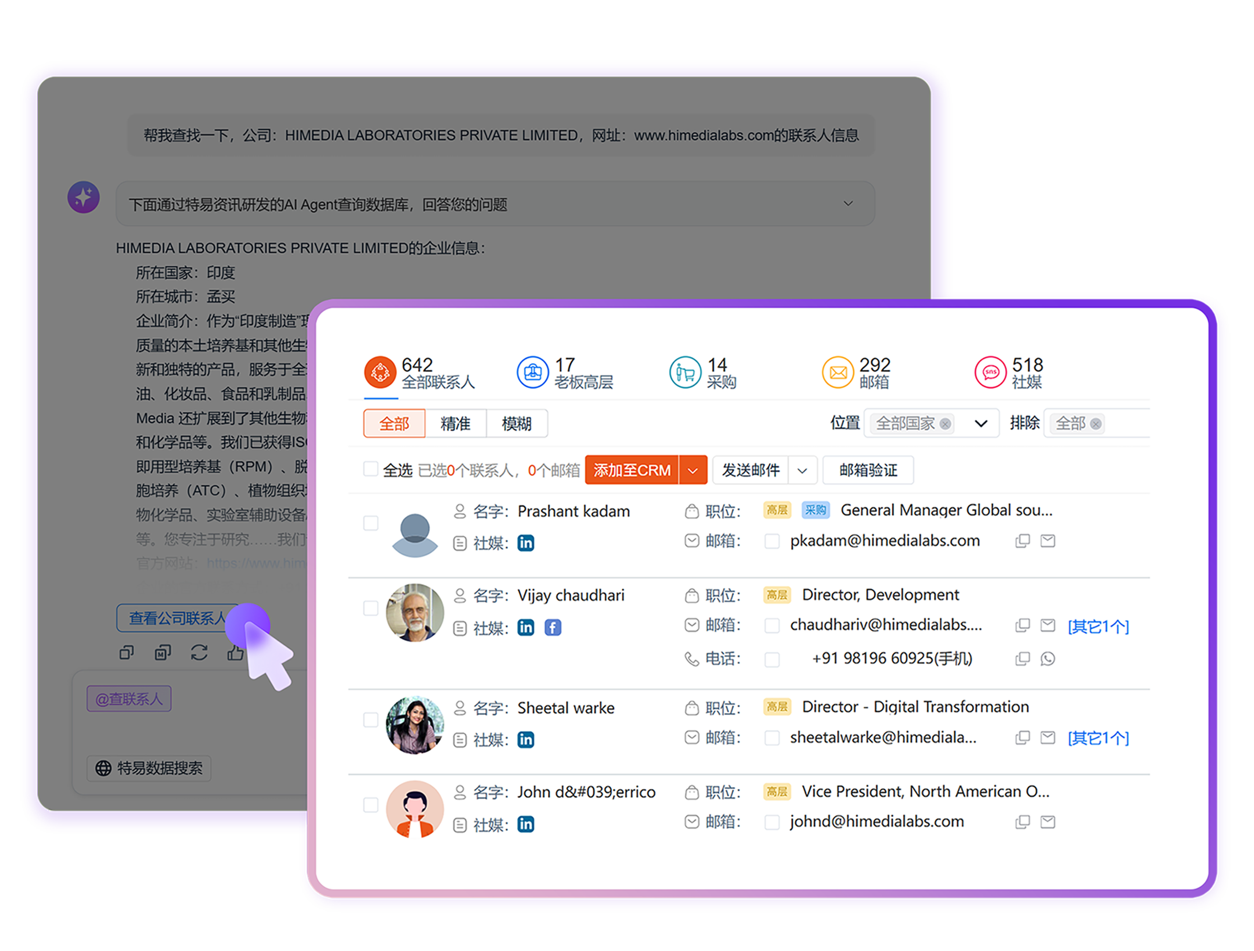 智能解析用户意图,AI自动提取参数后全库检索,精准挖掘到目标企业关键联系人。