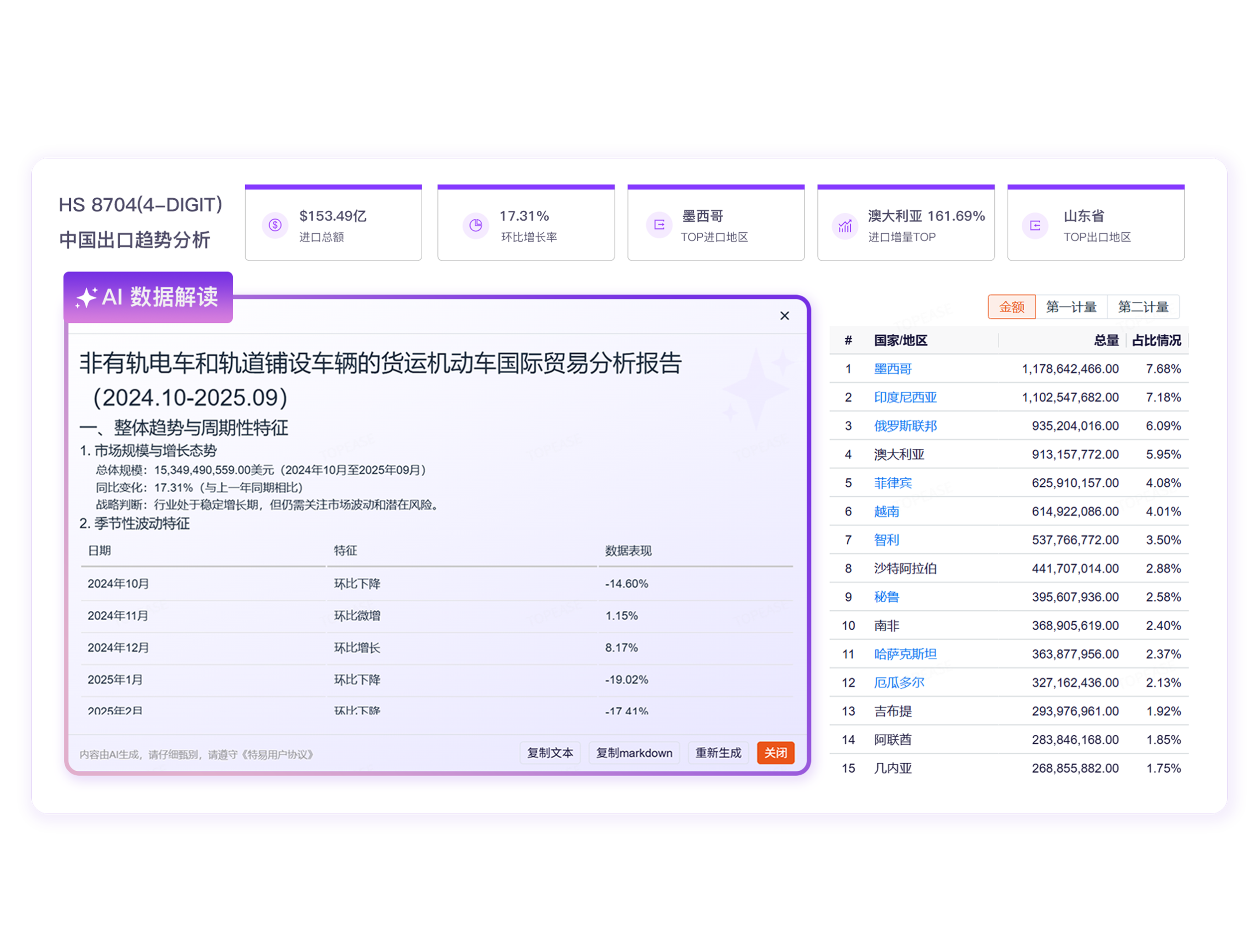 目标市场现状如何?产品的最优市场在哪里?小易AI帮您一键分析,从数据和图表中发现最大需求市场,和迅猛增长的新兴市场。