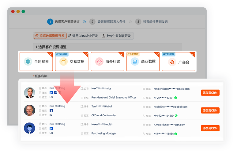 聚合多元联系人信息,精准挖掘关键人邮箱、电话及社媒等多维数据,一键直达社媒页面