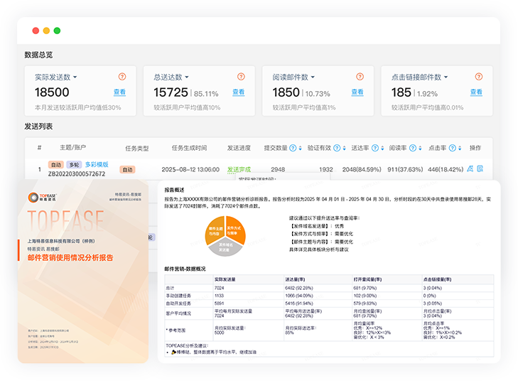 从开发计划制定执行,到营销效果数字化反馈全链路追踪,邮件打开率、阅读量、链接点击量等关键指标实时展现。结合每月易搜邮使用分析报告,阶段性总结复盘,优化后续营销方案,持续提升营销效能。