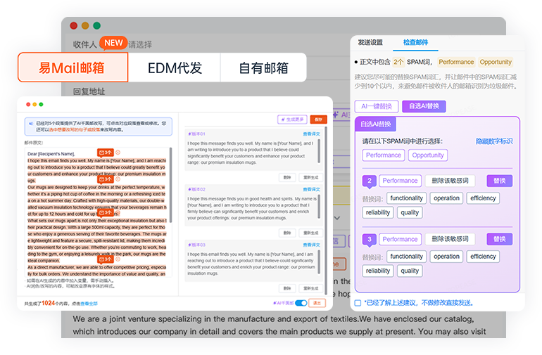 AI营销内容生成功能,支持多种语言,覆盖外贸全业务场景。无论何种营销需求,均可一键撰写媲美营销专家的邮件内容。结合营销内容检查与易Mail高质量邮箱通道,让更多邮件能成功送达到客户手中,显著提高邮件打开率与客户转化率。