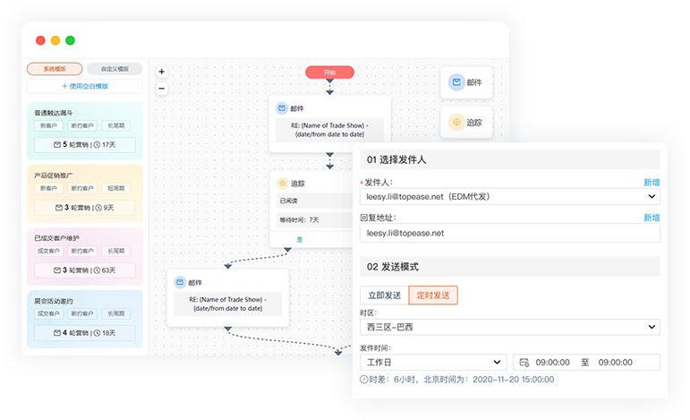 只需向小易AI提出需求,直接生成客户多轮触达全流程。触达工具与E平合CRM客户资源互通,根据客户分类直接发起合适的多轮邮件营销,7x24小时不断跟踪客户,与客户更快建立紧密联系并实时反馈营销效果,为您高效挖掘海量数据中的高价值客户。