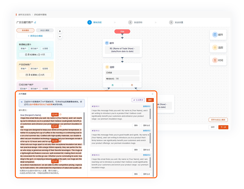 智能跟进做好客户培育AI驱动自动化流程,实现长效培育潜在客户,助力商机转化。预 设多轮客户跟进流程,分阶段触达客户,更贴合外贸业务开发需 求:在外贸客户较长的决策周期中,提供有效信息支持与客户感 兴趣的信息,最终提升成交可能。