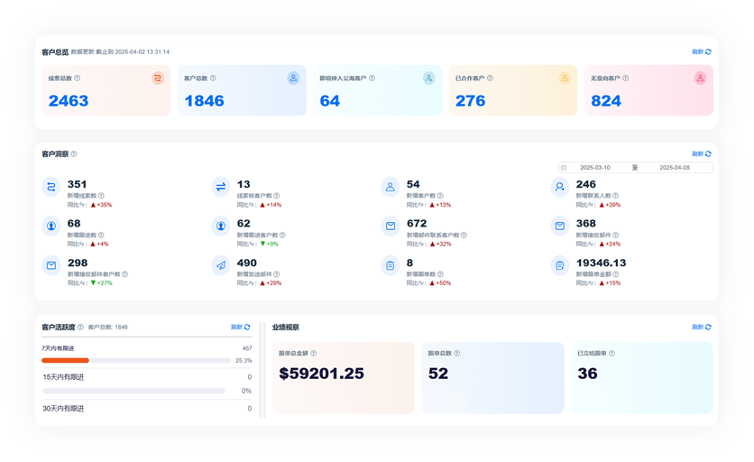贯穿全流程的客户管理满足企业全链路客户管理需求,产品设计贴合外贸行业需求,同平台产品使用更便捷,功能贯穿客户开发全流程。与线索平台数据互通无缝衔接,有效规避因外接工具导致的数据孤岛问题,让外贸企业客户管理更高效。