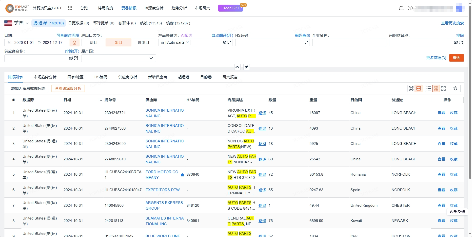 外贸资讯宝GT6.0拥有强大的多源数据整合能力,这是全面呈现美国出口汽配品牌信息的基础。它深度对接全球各国海关数据,海关数据详细记录了美国汽配出口的关键信息,包括产品名称、HS编码、出口企业详情、出口目的地以及交易金额等。通过这些数据,能够清晰地看到诸如美国某知名汽配企业生产的特定型号发动机零部件的出口情况,了解到其主要出口到哪些国家和地区,以及在不同时间段的出口规模变化。