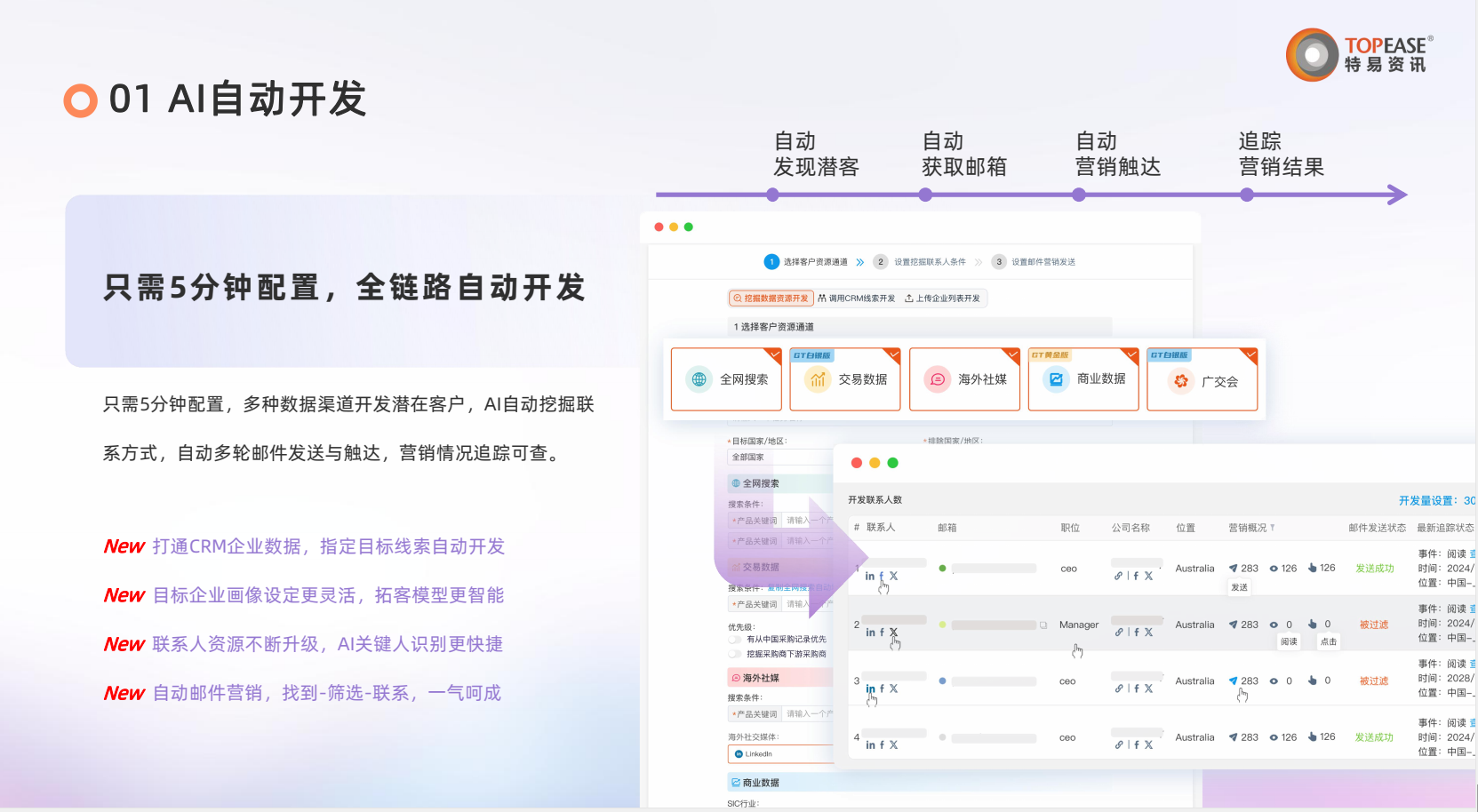在寻找外贸群发邮件的工具时,特易资讯的易搜邮 v5.0 是一个值得考虑的选择,易搜邮 v5.0 是特易资讯旗下的一款全球企业联系人搜索平台,具有多种实用的内置功能: