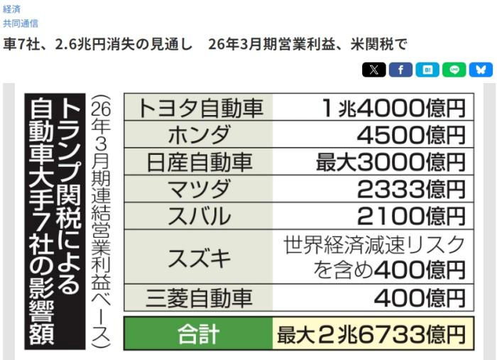 今年4月起,美国将日本汽车进口关税从2.5%大幅提高至27.5%,尽管9月后降至15%,但仍远高于此前水平。这一政策导致日本七大车企上半财年利润同比下降约三成,合计损失1.5万亿日元。