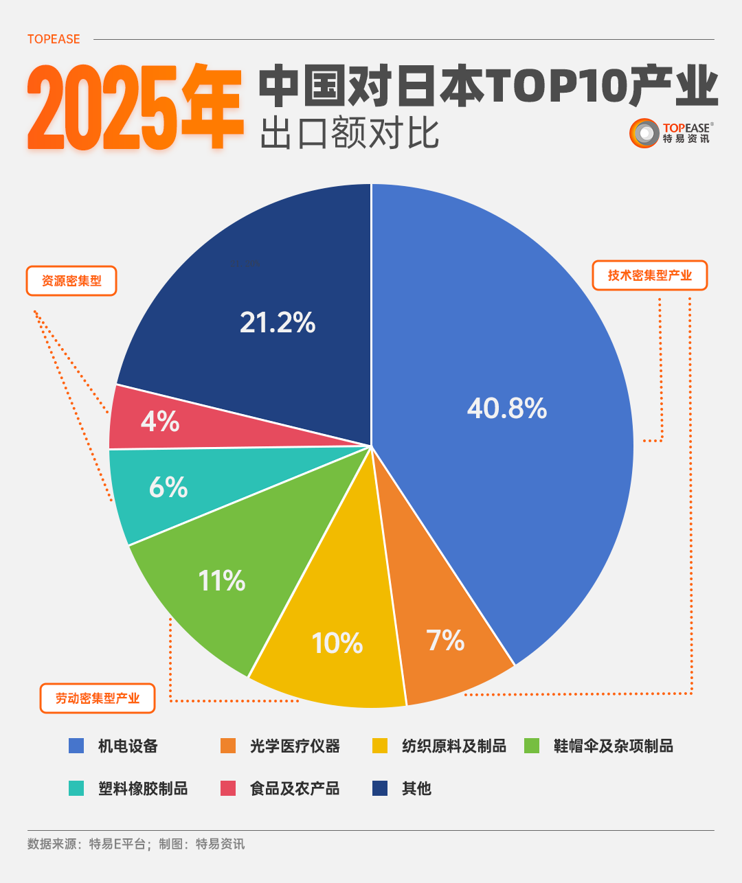 中国作为日本最大贸易伙伴,对日本出口的产业结构呈现多元化特点。2025年中国对日本前10大产业出口额对比如下图: