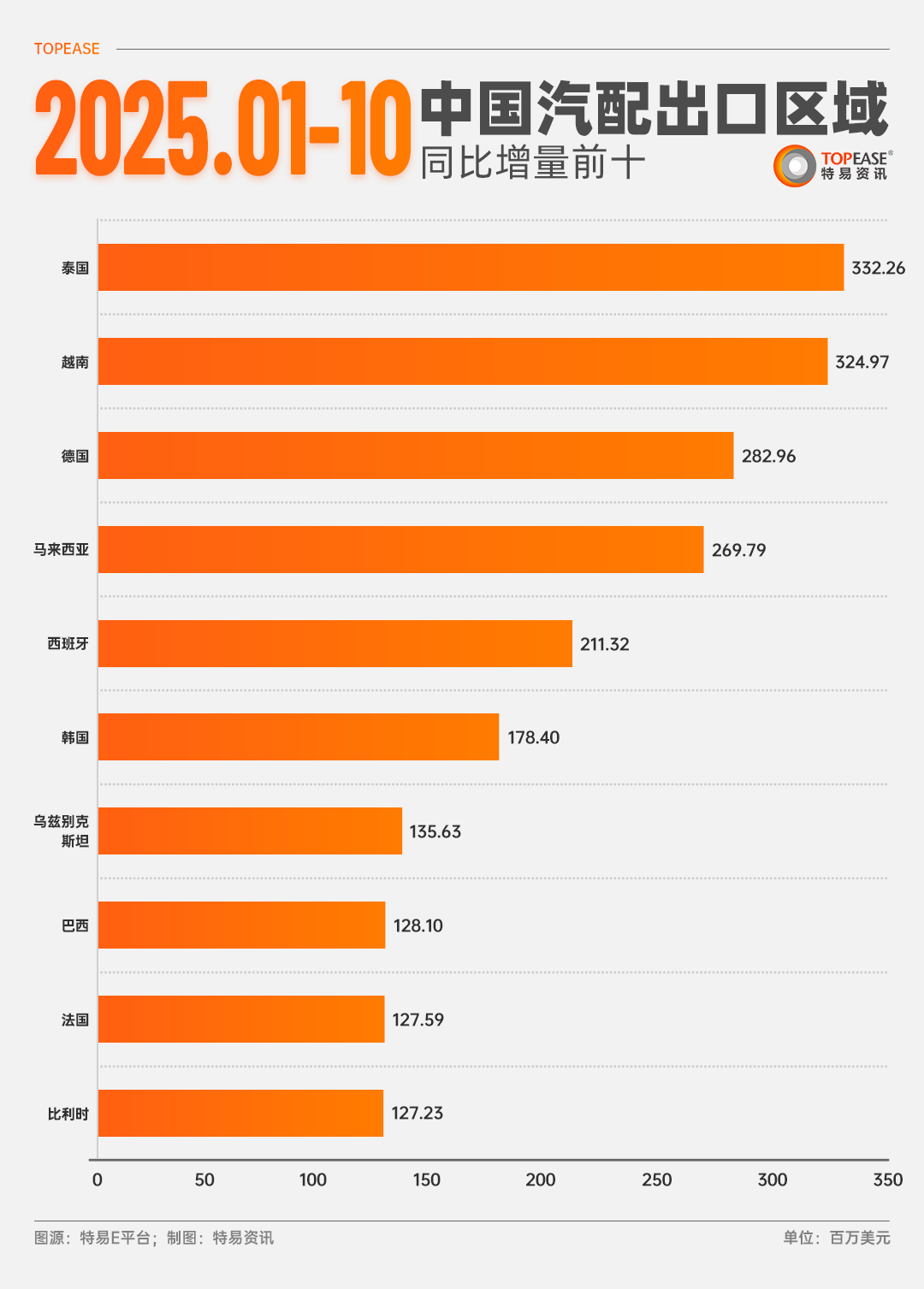 美国仍是第一大出口目的国,但值得注意的是,新兴市场增长强劲:对泰国出口增量达 3.2亿美元,德国和东南亚等国家亦是增长迅猛的新兴市场。