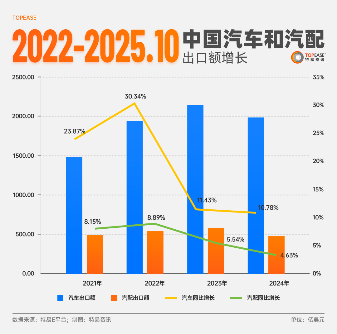 这耀眼的整车出口数据背后,也能看到近几年我国汽车配件出口同步增长趋势。