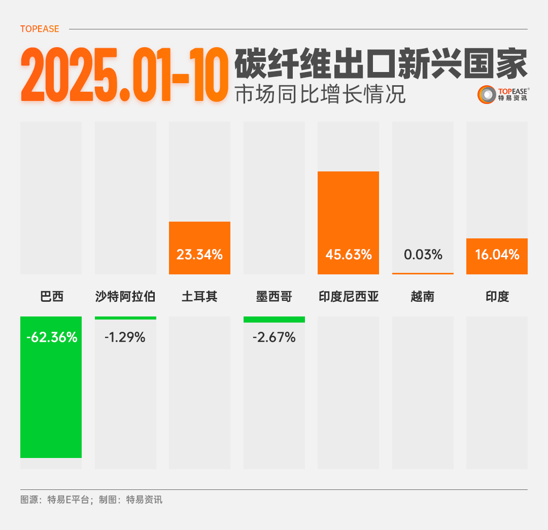 2025 年1-10 月中国碳纤维出口市场集中度较高,印度、土耳其、印度尼西亚等新兴市场增量显著,成为出口增长新引擎。