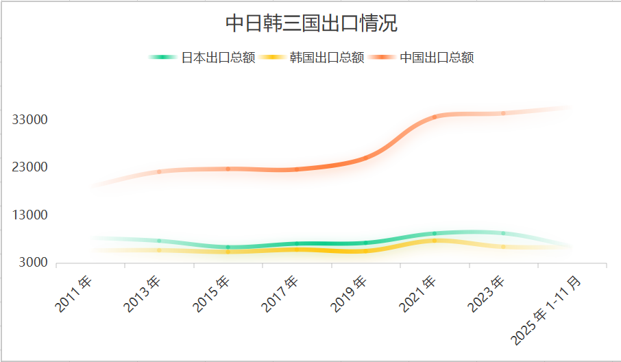 2011年至2025年1-11月,中日韩出口走势分化显著:中国出口持续增长且2019年后加速,日韩则在2021年后回落,中国在东亚出口格局中的主导地位进一步强化,日韩出口受外部需求和产业调整影响增长乏力。