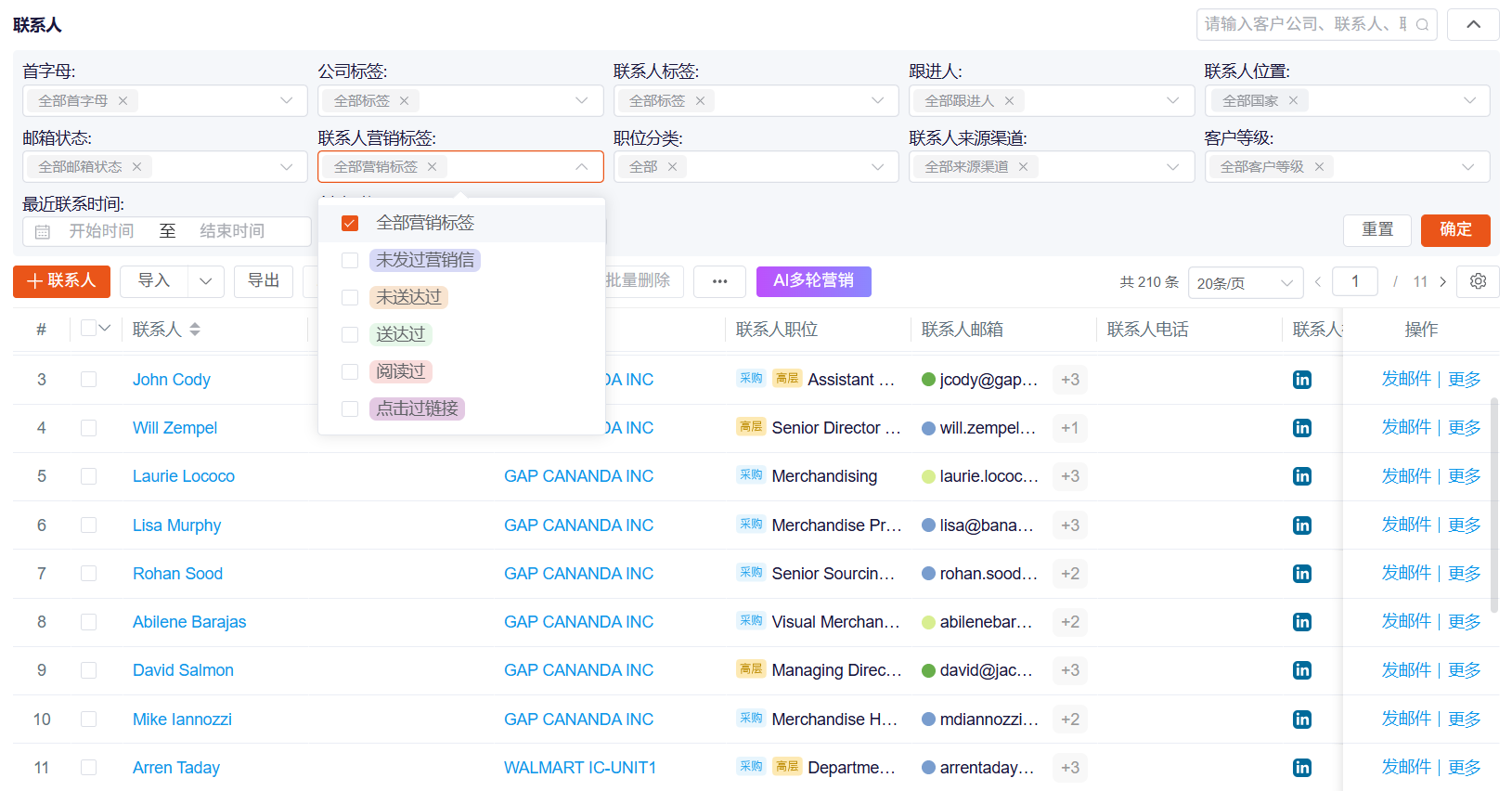 1. 首轮推送:基于AI获客标签生成“需求痛点+产品价值”型推广内容,结合客户时区选择最优发送时段,发送状态、打开时间自动同步至CRM;
