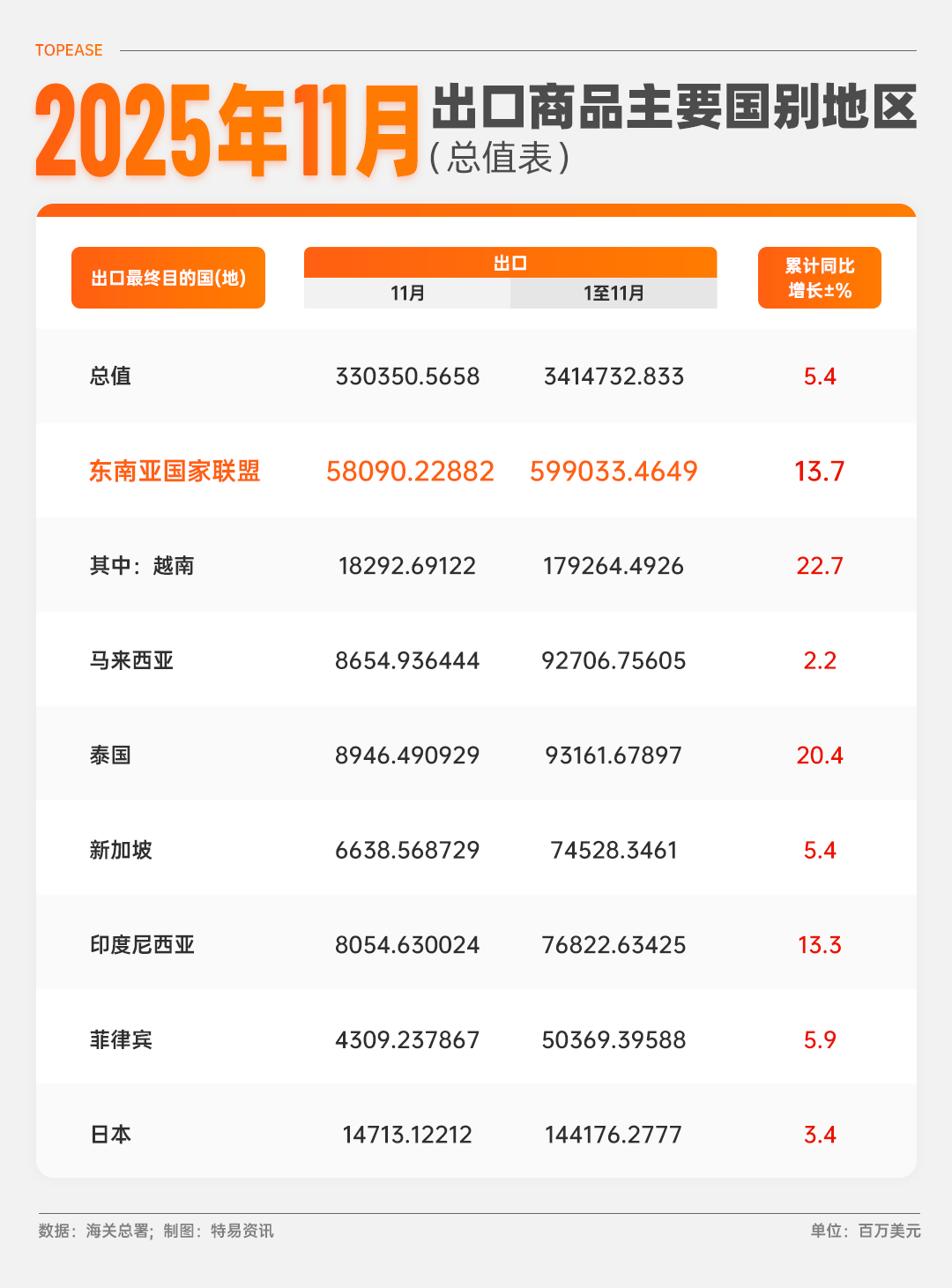 交通运输部数据显示,2025年前11个月,中国完成港口货物吞吐量167.5亿吨,同比增长4.4%;集装箱吞吐量达3.2亿标准箱,同比增长6.6%。同期,中国货物贸易进出口总值达41.21万亿元,同比增长3.6%,其中出口24.46万亿元,增长6.2%。