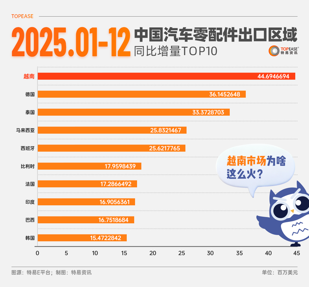 在2025年中国汽车零配件出口区域同比增量榜单上,越南高居首位,成为年度最大“黑马”。这一现象背后,是多重因素共同驱动的结果。