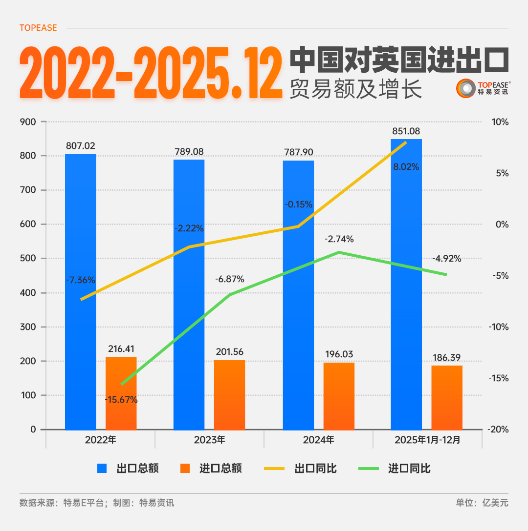 2022-2024年中英贸易持续低迷,而2025年出口同比逆势大增8.02%,进口降幅扩大至4.92%,形成鲜明反差