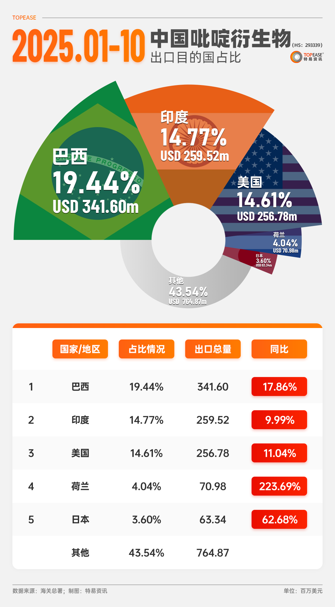 在所有医药中间体品类中,吡啶衍生物(HS:293339) 的出口态势极具代表性,清晰勾勒出全球需求的集中地。