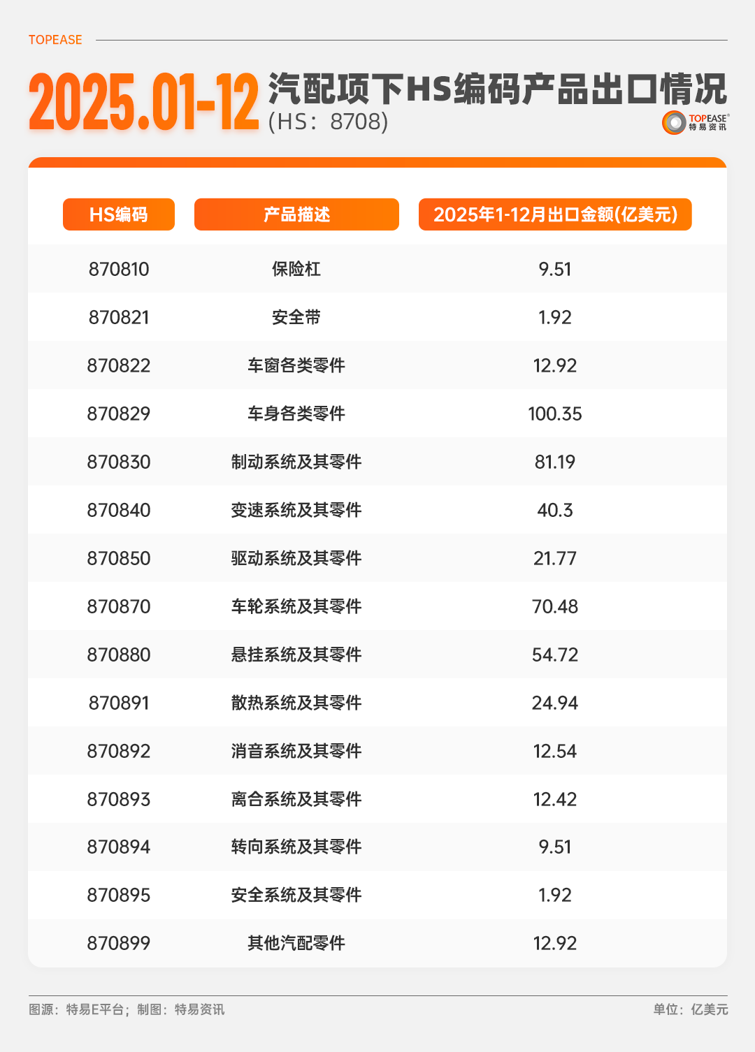 增长动力源于“品类升级”:车身零件(870829)、制动系统(870830)、车轮系统(870870)出口额稳居前三。