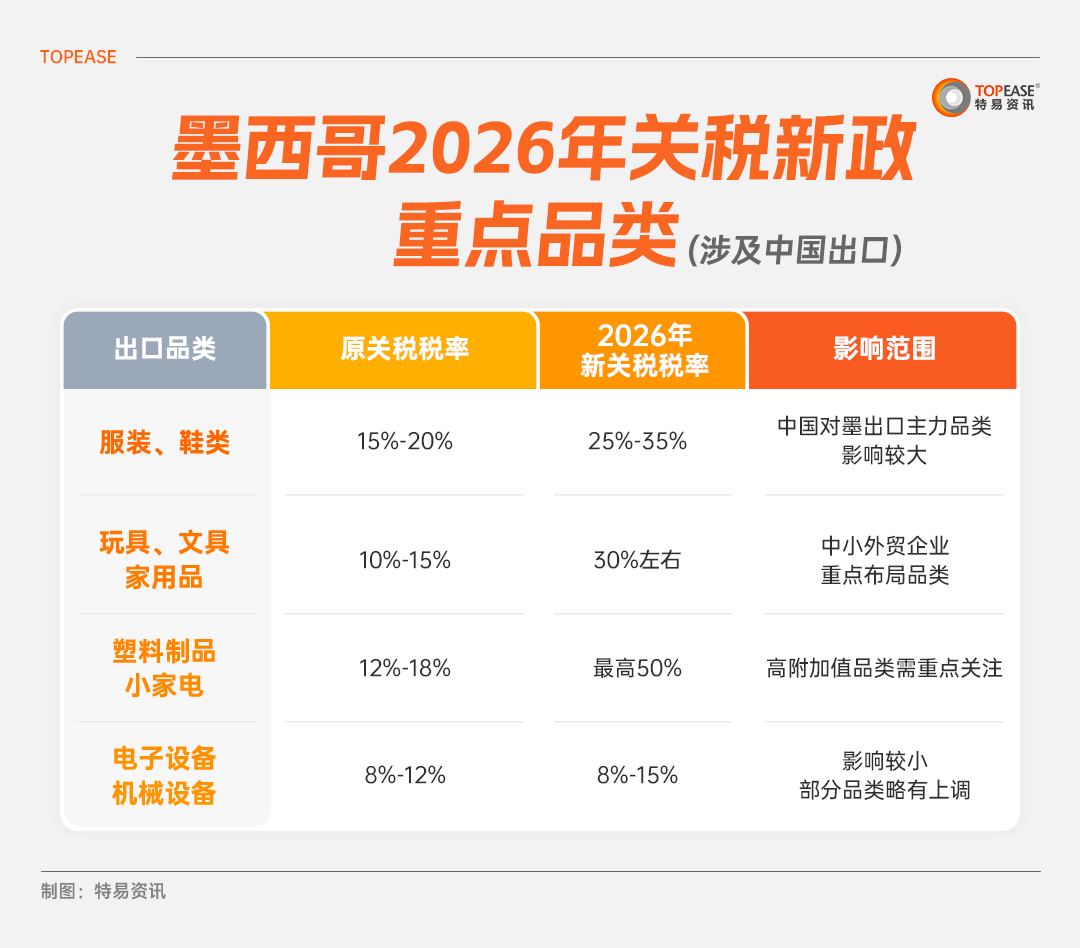 一是墨西哥2026年关税新政对中国部分出口品类不利,尤其是服装、小家电等;