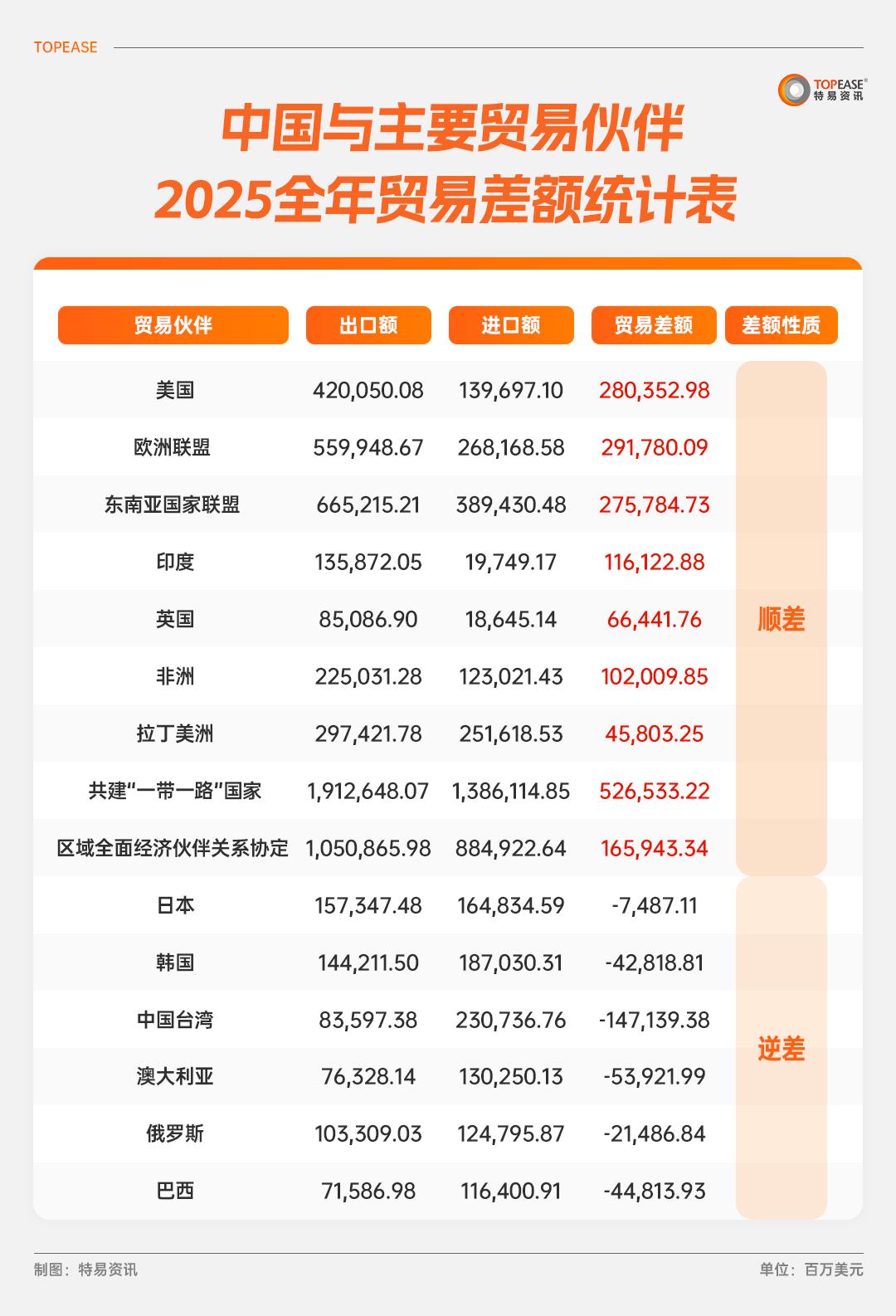 2025年中国对外贸易整体呈现大规模顺差。顺差的主要来源地为美国、欧盟、东盟及部分新兴市场,而逆差则主要集中于中国台湾、韩国、澳大利亚等关键原材料和零部件供应地。