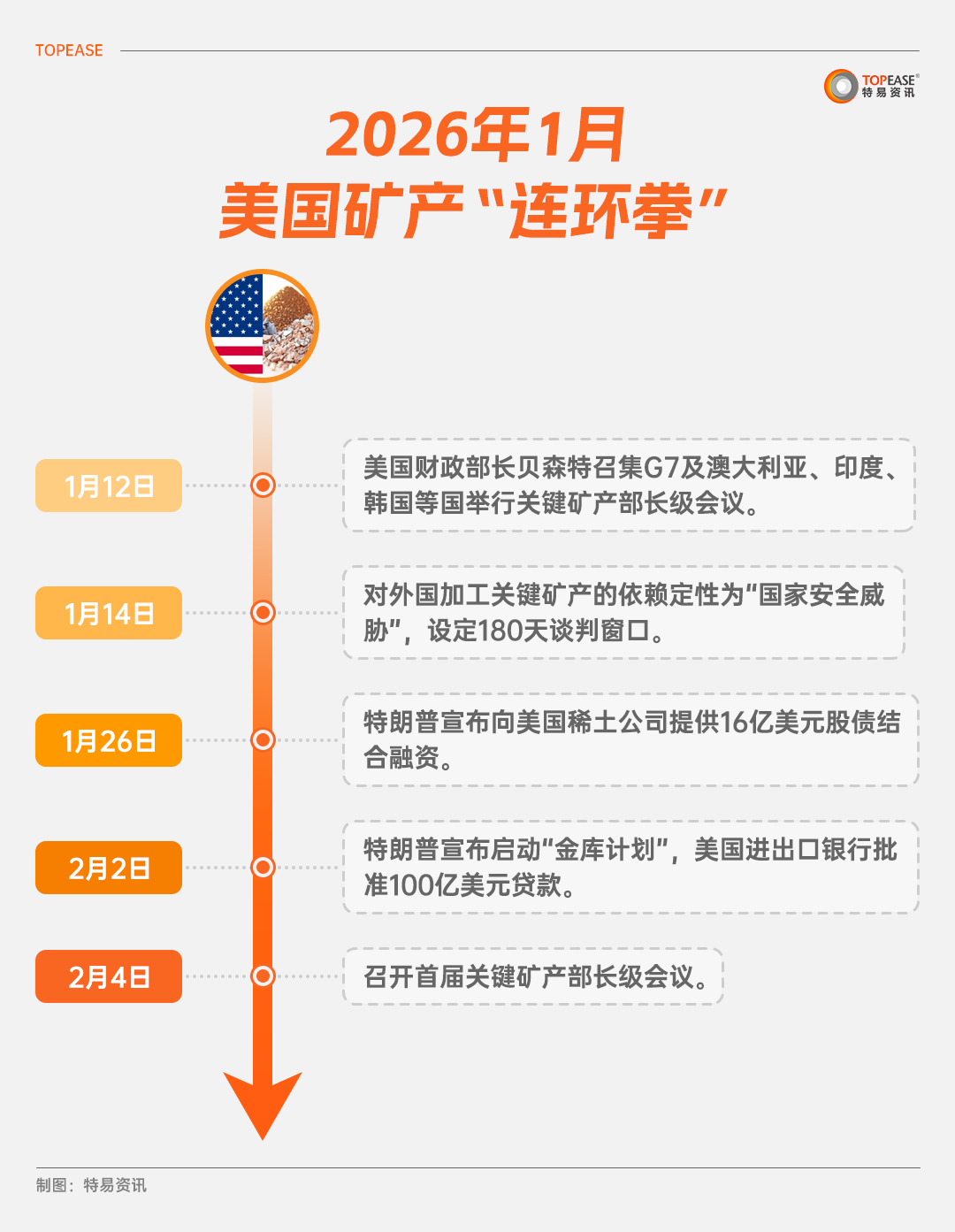 美国自身资源存在严重的生存危机,且民用领域长期缺乏战略矿产储备,叠加 2025 年中方稀土出口管控的反制教训,急于摆脱供应卡脖子风险,仅2026年1月就相继出台多项措施应对矿产资源生存危机。