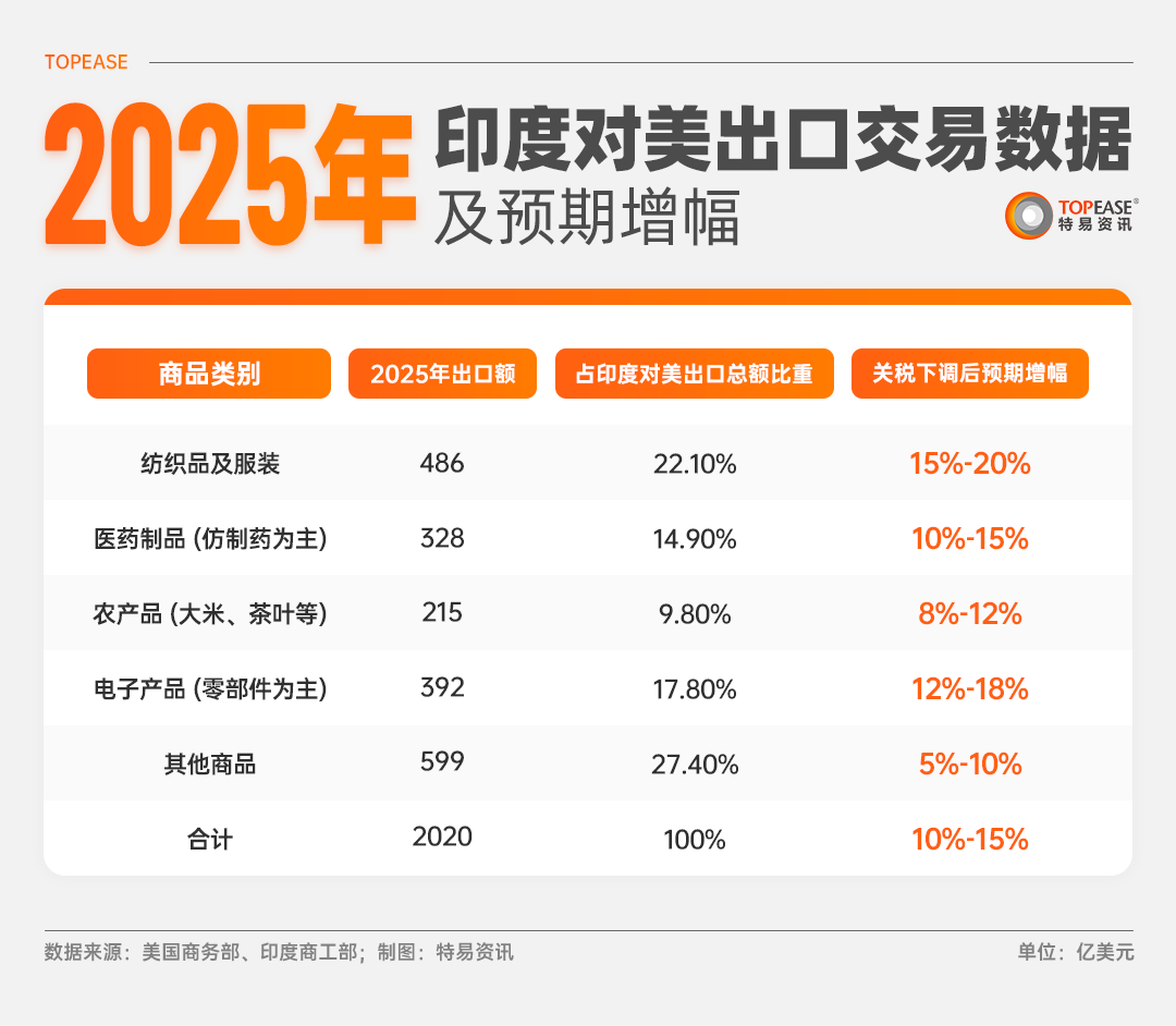 关税大幅下调后,印度输美商品的价格竞争力显著提升,尤其是劳动密集型、轻工业品类受益最明显。