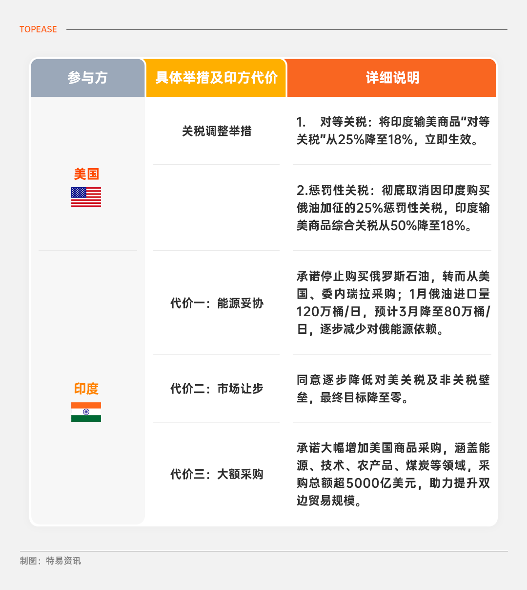 关税下降直接降低印度商品出口成本,助力其抢占美国中低端市场;挑战则在于,印度需满足美国的采购要求,可能导致本土能源成本上升、市场被美国商品挤压,且部分产业依赖进口原材料,抗风险能力较弱。