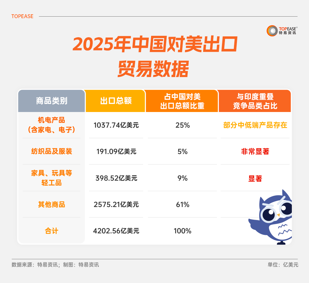纺织品、服装、轻工品等劳动密集型品类,印度凭借关税优势可能分流部分美国订单,尤其是中小批量、低附加值订单。