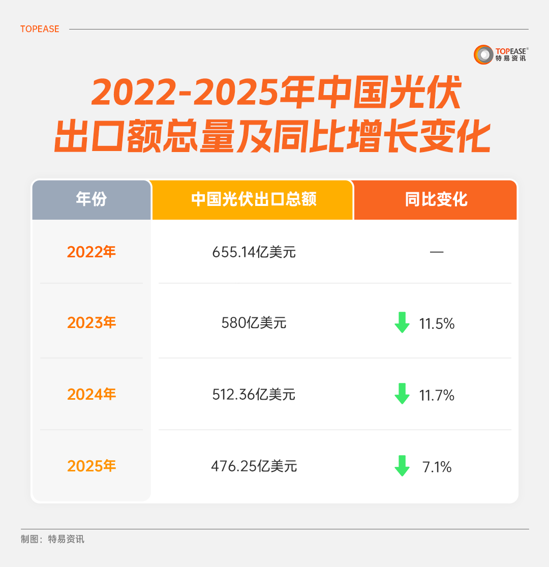 表面上看,2022-2025年中国光伏出口总额从655.14亿美元降至476.25亿美元,确实在跌。但如果只看这个“大盘”,你可能就错过了真正的机会。