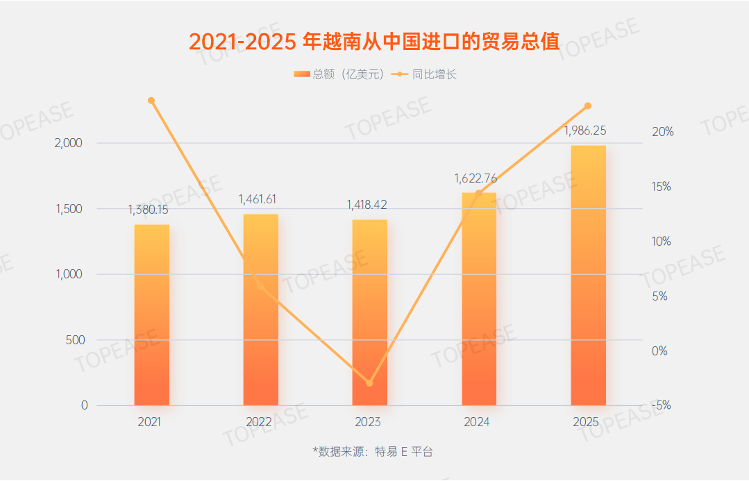 以越南为例,2025 年越南从中国进口总额 1986.25 亿美元,同比增长 22.40%,增速远超中国整体出口增速,中国连续多年稳居越南第一大进口来源国。
