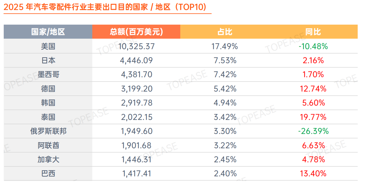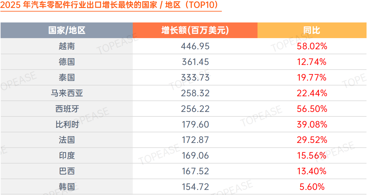 2025 年汽车零配件出口区域呈现明显的市场转移与结构性调整特征。美国虽以 103.3 亿美元居首,但受贸易摩擦及原产地规则收紧影响,与此同时,越南、泰国、马来西亚等东南亚国家增长强劲。