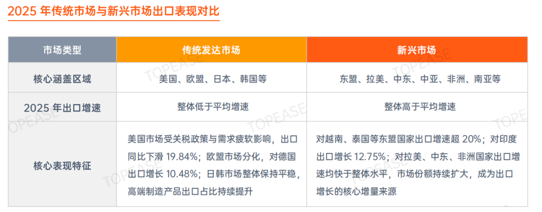 2025 年中国出口市场覆盖全球 200 多个国家和地区,市场布局持续优化,形成了 “东盟为核心、欧美为重要支柱、新兴市场快速增长” 的多元化格局。