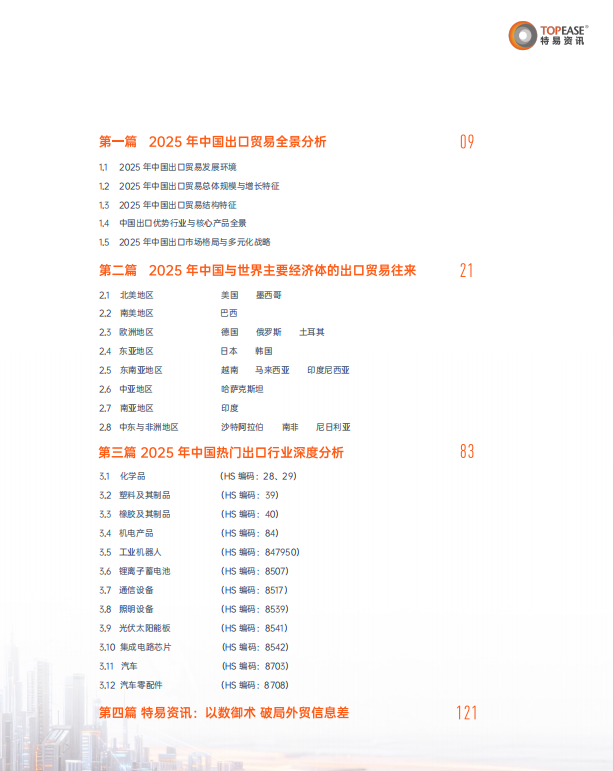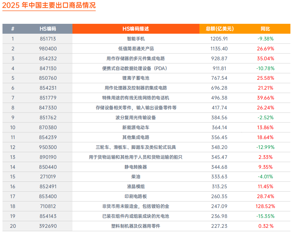 报告聚焦中国出口最具代表性的12大品类,逐一解析市场现状、主要竞争国、高增长子品类: