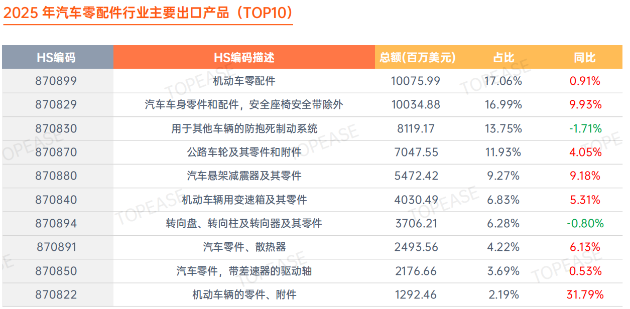 以汽车零配件为例——2025年,中国汽车零配件出口规模继续位居全球前列,2025 年中国汽车零配件行业出口总额达 689.52 亿美元,同比增长 9.93 %。