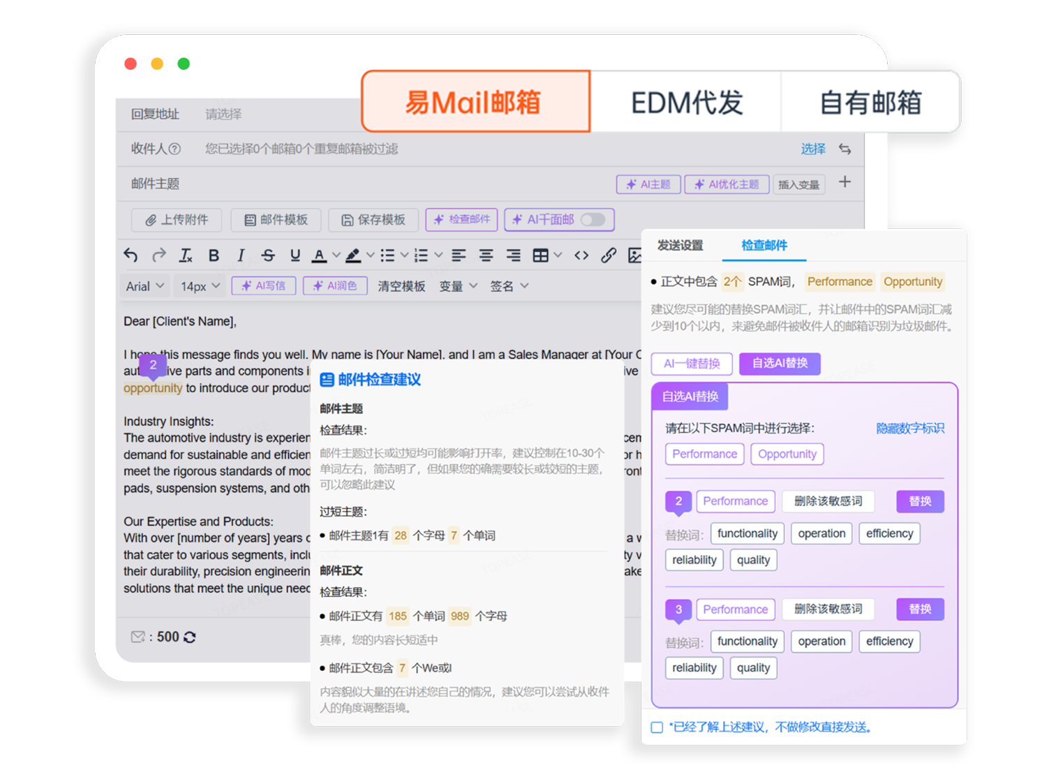 发送前让AI自动检查邮件营销内容,帮您替换高屏蔽词防止被系统 拦截,再使用易Mail高质量邮箱通道进行发送。让更多邮件能成功 送达到客户手中,得到更高的邮件打开率与客户转化。