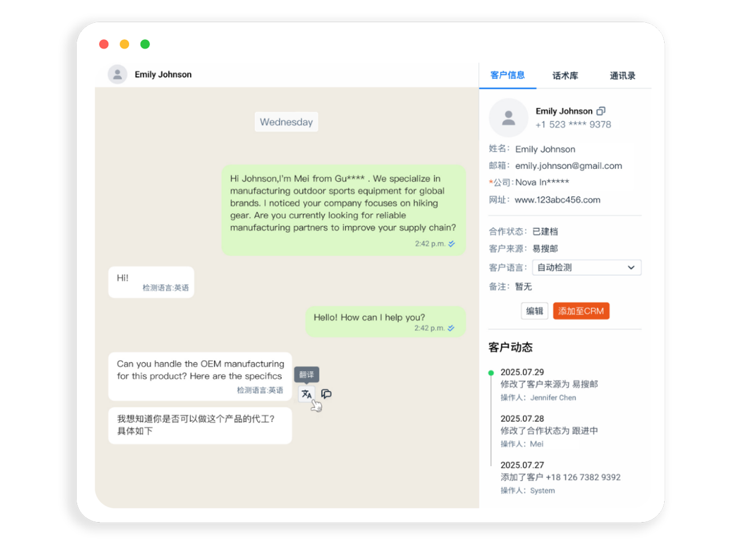 发送了开发信,客户却又"已读不回"?是时候升级客户开发方式了!用WhatsApp进行社媒营销,让您的消息直达目标客户,在平台登录个人账号,与客户即时互动,快速建立紧密联系。