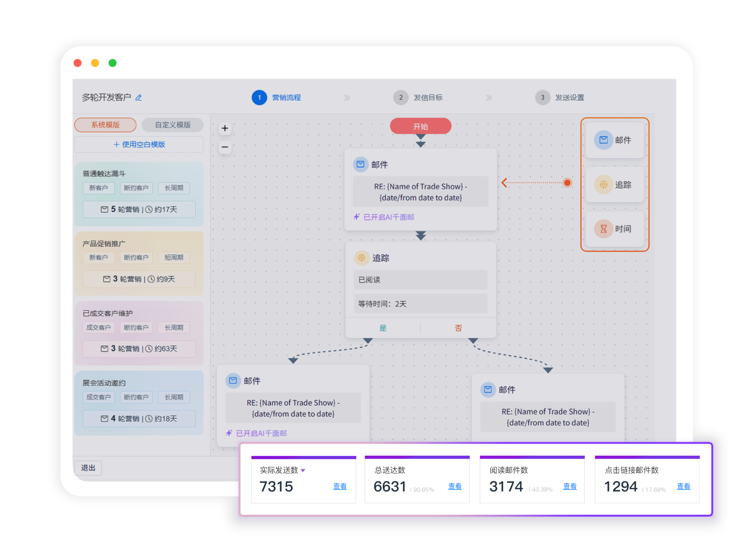 担心跟进不及时错过商机?不用害怕,多轮电子邮件营销流程精准出击随时与潜在客户建立紧密联系,相当于一个7X24小时工作的团队帮您实时跟踪客户,营销效率飙升!