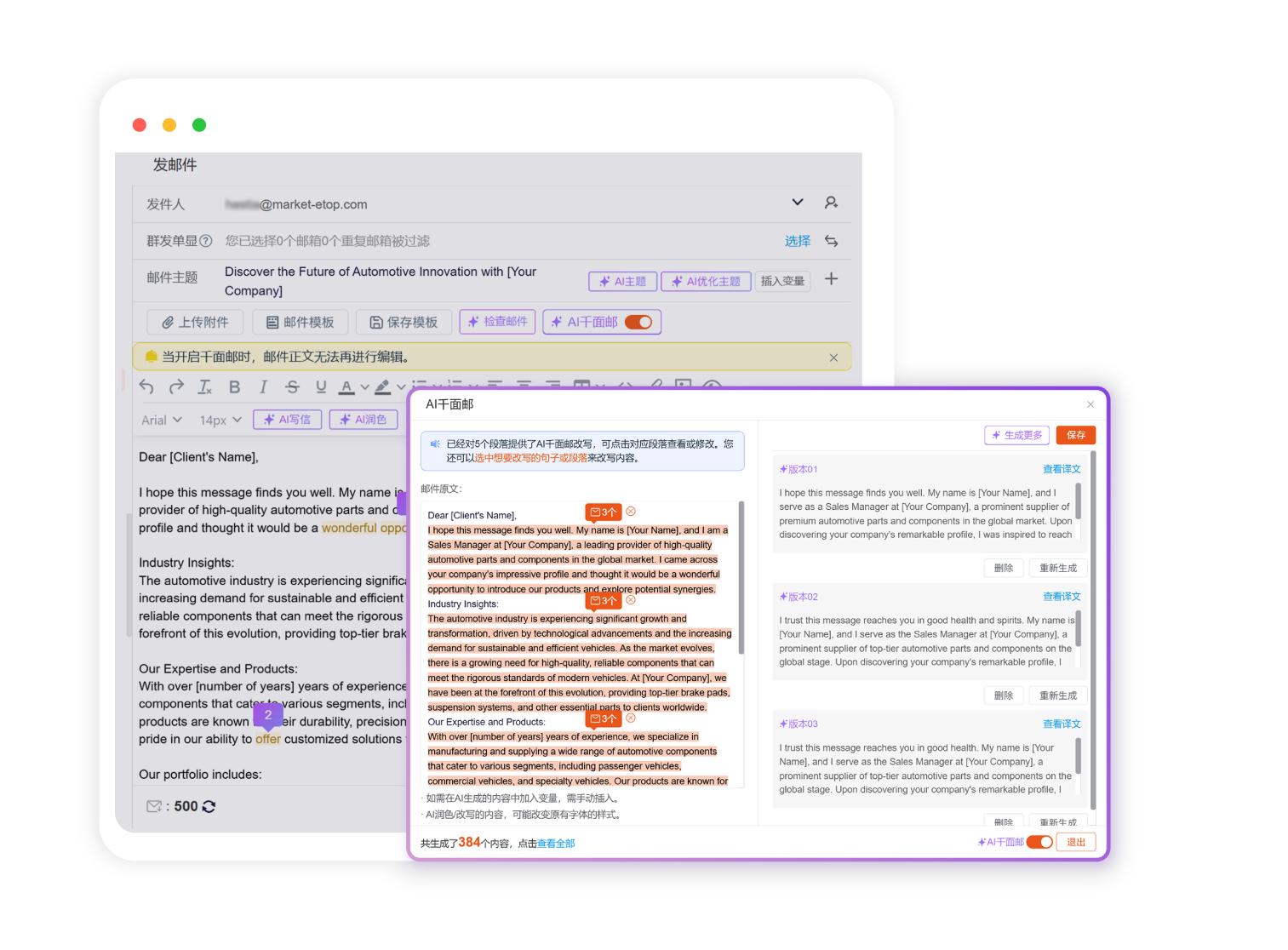 各国语言的营销文案和措辞风格,AI都能帮您写!生成的邮件内容既符合文化差异,又能精准触及目标受众。您的群发邮件将不再是单一模板的复制品,而是充满个性化和针对性的营销沟通工具,让营销获客效率更高。
